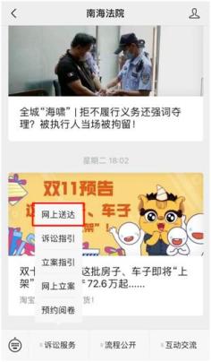 电子送达适用除判决书、裁定书、调解书以外的诉讼文书,但当事人同意的除外。 在南海法院,依托电子卷宗系统,法院工作人员可以高效送达诉讼材料。 您可以通过广东法院诉讼服务网、手机短信及微信签收诉讼文书,完成电子送达全流程。电子送达作为新兴的送达方式,通过互联网服务向当事人送达电子司法文书,速度快、成本低,不受时间和空间限制,收件方便,没有邮件丢失的风险,安全放心。电子送达方式的实行,提升了司法效率,也为诉讼当事人提供了便利。 广东法院诉讼服务网 选择通过广东法院诉讼服务网进行电子送达时,当事人可通过南海法院微信公众号底部栏目入口点击查看平台送达的操作指引及平台登录入口。