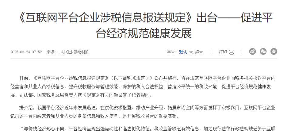 【环球网财经综合报道】自2025年10月1日起,互联网平台企业将依据国务院发布的《互联网平台企业涉税信息报送规定》,正式向税务部门报送平台内经营者和从业人员的身份信息、收入信息。新规实施引发广泛关注,特别是对外卖员、快递员等从事便民劳务活动的“小哥”群体将有何影响呢? 资料图 图片来源:官网截图新规...